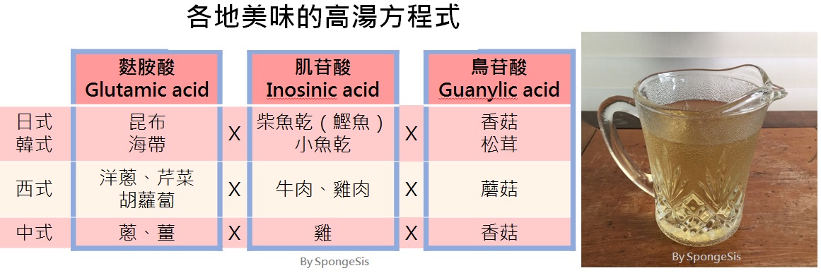 湯頭的好滋味,主要是食材在熬煮的過程中,會釋放出多種的胺基酸。不論是中式大骨湯,或是法式清湯,都要花時間才能有好湯頭,然而日式、韓式則用單純的食材昆布、小魚乾來煮,只要花不到半小時的時間,就有一鍋好湯頭。日本本著研究精神,發現湯頭內的好滋味,是由不同的食材在多種胺基酸加乘共鳴下,讓舌頭味蕾來產生交響樂曲。原來舌頭味蕾所感受到的味道,除了酸、甜、苦、鹹四味之外,還多加了第五味「旨味」,日本將這好湯頭稱之為旨味(うま味Umami);中文可用「鮮味」來表達;英文則用「Savory、Brothy」來表達,而最早運用鮮味(旨味Umami),除了中國之外,就是古羅馬的魚露。而日本於1985年用Umami(旨味)當英文專有名詞在國際上通用,來表示食物的鮮美味道。鮮美湯頭主要是三種胺基酸系列:麩胺酸Glutamic acid、核酸系列的肌苷酸Inosinic acid、鳥苷酸Guanylic acid。所以在煮高湯時,放入含有高量的三種成份的食材,就可以煮出美味的交響曲。
