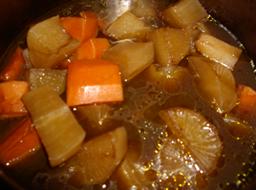 五、紅白蘿蔔則另準備一鍋來滷,滷汁和前面一樣,滷過蘿蔔之後的滷汁多了蔬菜的鮮甜,跟滷肉的滷汁混合後,就是未來美味牛肉湯的湯底。
